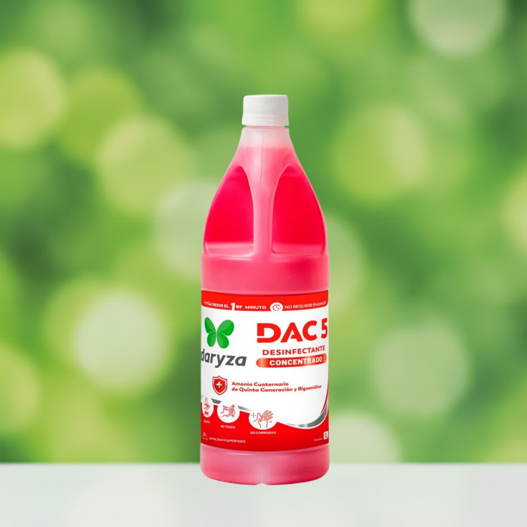 DAC 5 es un potente y concentrado desinfectante formulado a base de Amonio Cuaternario de Quinta Generación y Biguanidina Polimérica los cuales ofrecen acción germicida frente a un amplio espectro de gérmenes y bacterias.